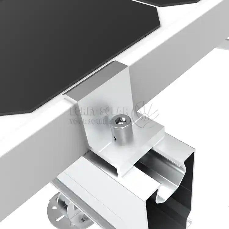 मिड क्लॅम्प ॲरेच्या मध्यभागी स्थापित केला जातो आणि दोन समीप घटकांच्या आतील फ्रेम्स एकाच वेळी पकडतो, दोन समीप घटकांद्वारे प्रसारित होणारी शक्ती धारण करतो. हे प्रामुख्याने ऊर्ध्वगामी वारा उचलण्याच्या शक्तीला प्रतिकार करते. मिड क्लॅम्पचे दोन्ही टोक उघडे असतात आणि ते पॅनेल ठेवण्यासाठी वापरले जातात.