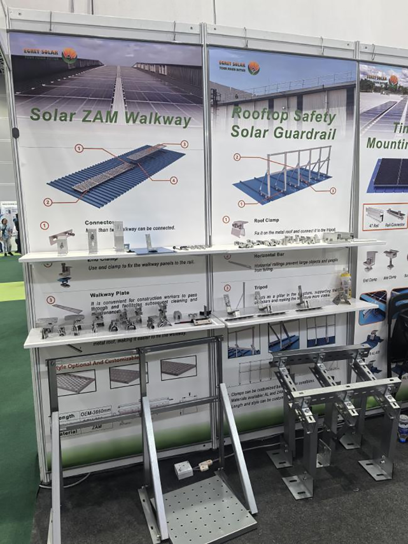 प्रदर्शनात, आम्ही क्लॅम्प्स, हुक आणि एल फूटसह अनेक छतावरील उपकरणे प्रदर्शित केली. ग्राहक त्यांच्या इन्स्टॉलेशनच्या वातावरणावर आधारित भिन्न संयोजने निवडू शकतात. क्लॅम्प्स किंवा एल फीट कलर-कोटेड स्टील टाइलसाठी वापरले जातात, तर छतावरील टाइल हुक सोलर सिरॅमिक टाइल्ससाठी वापरले जातात. आम्ही ग्राहकाच्या कलर-कोटेड स्टील टाइल मॉडेलच्या आधारे क्लॅम्प्स सानुकूलित करू शकतो किंवा ऑन-साइट वापरासाठी हुकचा हात वाढवू शकतो.