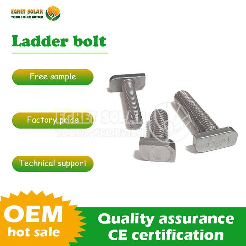 सौर पॅनेलच्या स्थापनेसाठी फ्लॅंज नटसह टी बोल्ट मध्यम आणि शेवटच्या क्लॅम्पसह वापरला जातो आणि सामान्यतः सौर फोटोव्होल्टेइक पॅनेलच्या मध्य किंवा शेवटच्या क्लॅम्प्स सोलर फोटोव्होल्टेइक माउंटिंग रेलमध्ये निश्चित करण्यासाठी वापरला जातो. ऑपरेशन सोपे आहे. अंतर्गत आणि शेवटच्या क्लॅम्प्सचे निराकरण करताना, तळाशी समांतर असलेली खूण सोलर मॉड्यूलच्या काठाशी समांतर असल्याची खात्री करा.